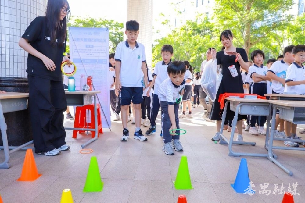 “药品安全射击大作战”摊位前,同学们手持粘球枪瞄准标靶,击中后要回答对应的安全用药知识问题,既要当“神枪手”,又要做“知识达人”;“安全用药套圈大挑战”也吸引众多同学排队,大家得先成功套中目标物,获取知识点卡片并准确作答才能赢得奖励,每次成功套圈和答对都伴随着欢呼;“神农识药大挑战”让同学们近距离接触岭南中药材实物,通过观察药材特征记录信息,还能参与药材盲盒挑战,准确说出药材名称及功效就能拿奖品,在趣味挑战中感受中医药神奇;“中药香囊制作体验”摊位上,同学们亲手挑选艾叶、藿香等药材,认真制作专属中药香囊,在动手过程中直观感受中医药文化魅力。